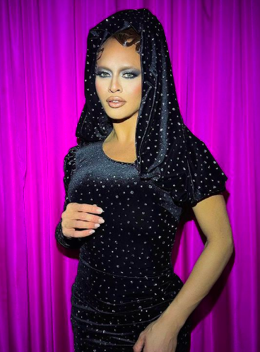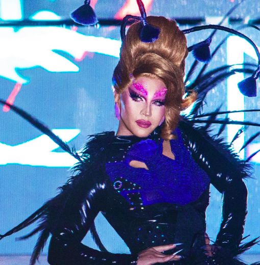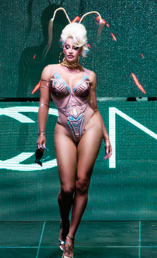 • Milk is in almost the same dress as Brooke Lynn but she is wearing butterfly scales in silver and her hips jut out horizontally.