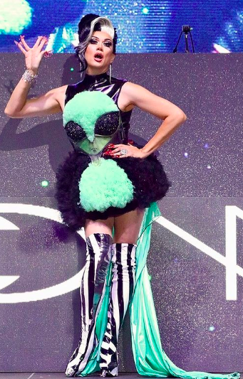 • Ryan Burke’s skirt is the moon and the top half of the bodice is a structured black see-through fabric and of course Burke’s makeup is out of this world with metal swirls and patterns.