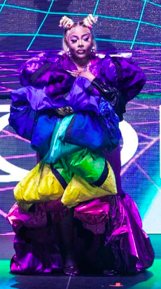 • TS Madison is in a hooded coat-dress with massive rainbow colored and purple bag- shaped layers and a simple purple fabric in the back.