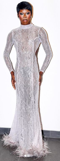 Fellow season 15 competitor Luxx Noir London was front row at the Retrofête show wearing a sheer, silver lace long sleeve column Retrofête dress with a silver fur trim on the bottom.