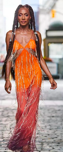 Jaida Essence Hall walked for Cucculelli Shaheen in a stunning warm orange to maroon gradient dress covered in spaced out long silver fringe that moves as beautifully as how she walks down the outdoor runway. There are cut outs underneath her breasts that lead to her back to show off Jaida’s body just a little but honestly all the attention is on her stunning face.