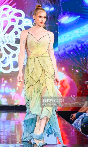 Jasmine Kennedie came back home to walk in the Breeoriginal fashion show. She is wearing a dress made out of layered light green to sky blue gradient sequin fabric with black borders that makes Jasmine look like Tinker Bell. She has on a healthy amount of blush and of course her face is beautiful.